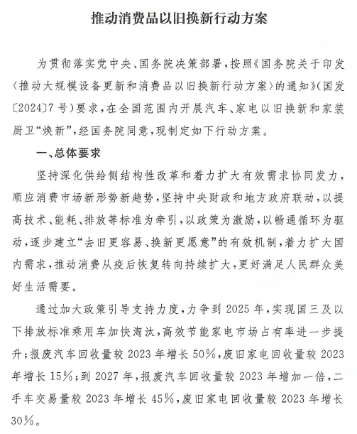 商务部等14部门印发《推动消费品以旧换新行动方案》4月12日对外发布。通过加大政策引导支持力度,力争到2025年,实现国三及以下排放标准乘用车加快淘汰顺发配资,高效节能家电市场占有率进一步提升;报废汽车回收量较2023年增长50%顺发配资,废旧家电回收量较2023年增长15%;到2027年,报废汽车回收量较2023年增加一倍,一手车交易量较2023年增长45%,废旧家电回收量较2023年增长30%。