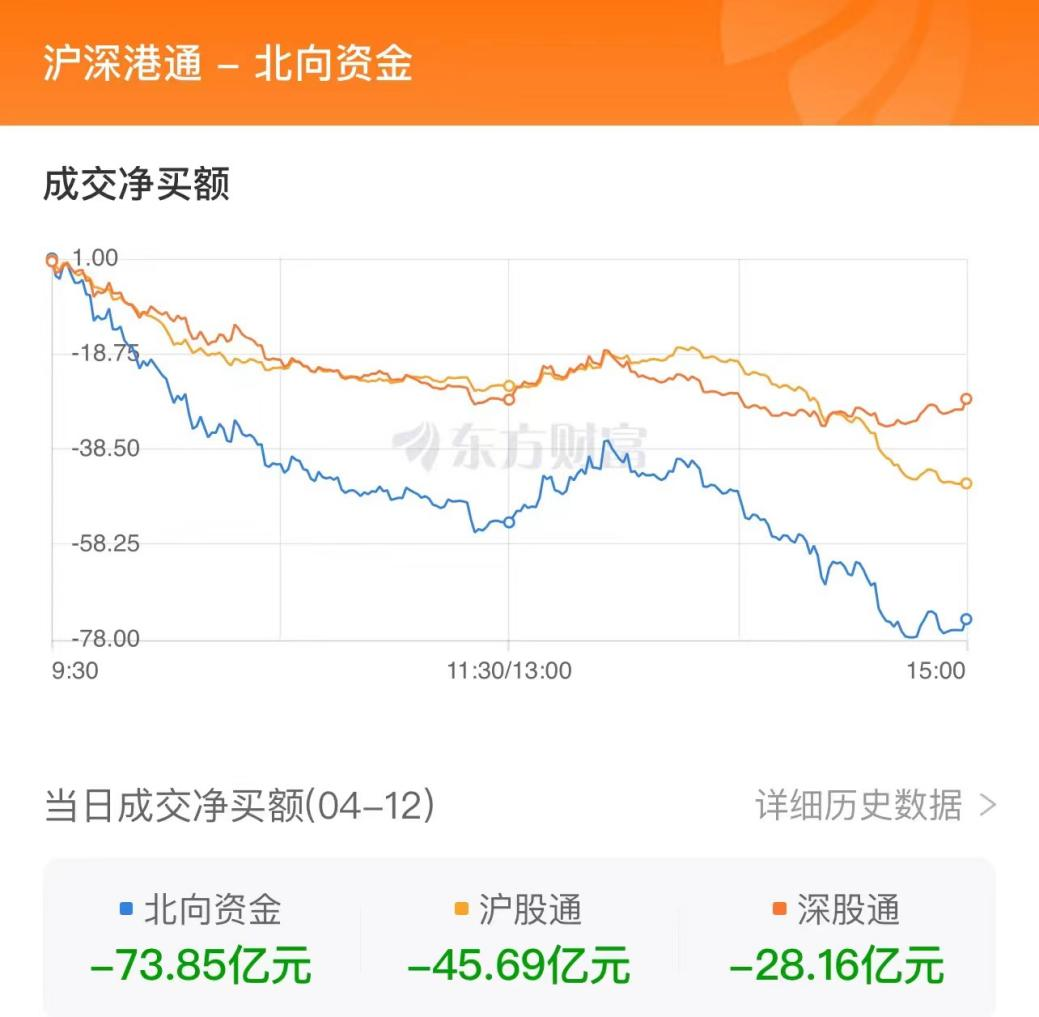 4月12日,两市震荡调整,创业板指领跌。北向资金今日净卖出73.85亿元,其中,沪股通净卖出45.69亿元,深股通净卖出28.16亿元。北向资金今日成交金额1242.30亿元,占A股总成交额的15.33%。