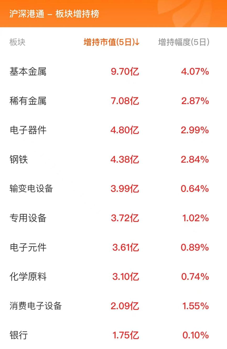 数据显示,近五个交易日,北向资金增持基本金属板块9.70亿元,增持稀有金属板块7.08亿元,增持电子器件板块4.80亿元。玻璃板块近五日增持幅度居前,增幅为11.12%,增持市值合计1.66亿元。