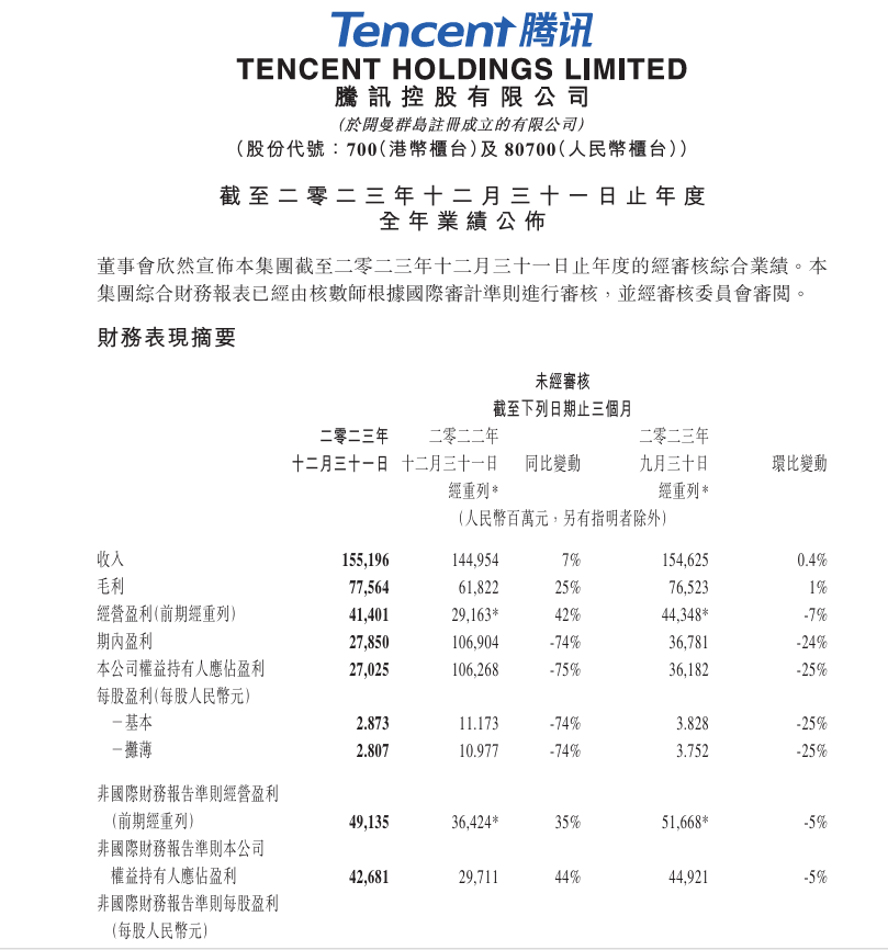 腾讯披露的2023年报显示,全年营收累计6090.15亿元,净利润(Non-IFRS)为1576.88亿元。2023年第四季度营收1551.96亿元,同比增长7%;净利润(Non-IFRS)426.81亿元,同比增长44%。